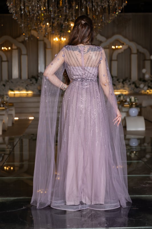 يتجلّى سحر حدائق البنفسج في ساعة الغسق ضمن هذا الفستان؛ كاب شفاف ينسدل من الأكتاف كضوء قمر مُصفّى، مرشوش بكريستالات براقة وزهور ثلاثيّة الأبعاد ك:أنّ ندى المساء تجمّد على بتلاته.