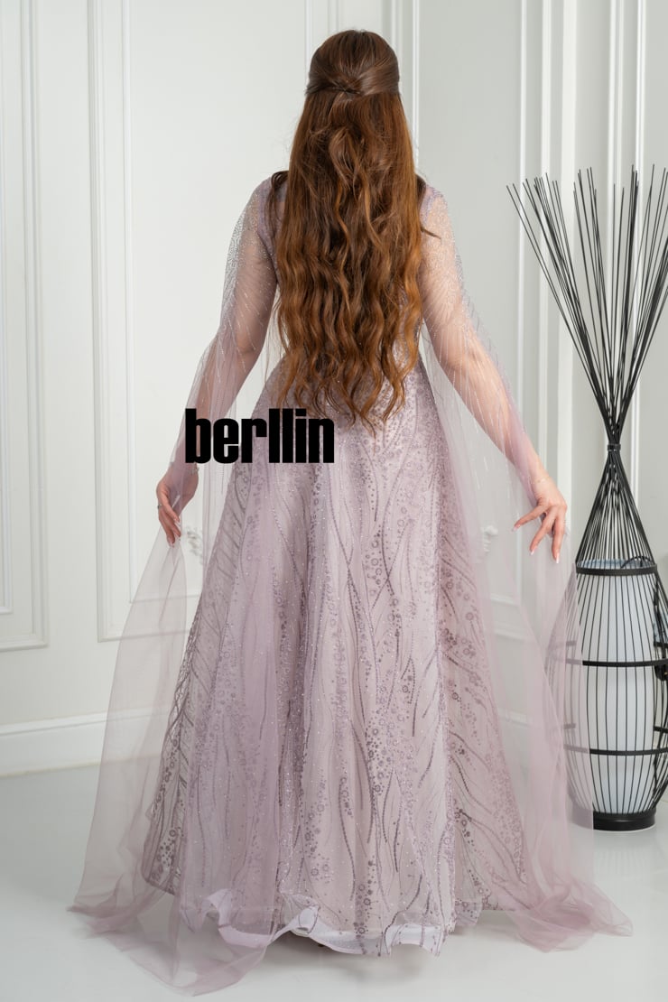 يأتي الفستان بلون لافندر ناعم مائل إلى الباستيل، وهو من أكثر الدرجات التي تعكس الأنوثة الهادئة وتمنح إشراقة مميزة للبشرة تحت الإضاءة. صُمّم من قماش فاخر بخيوط لامعة خفيفة تضيف لمسة بريق ناعمة تتراقص مع الحركة دون أن تفقد الاتزان أو الأناقة.