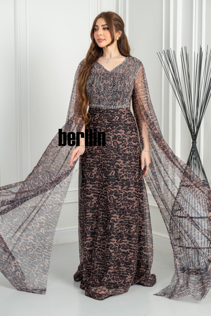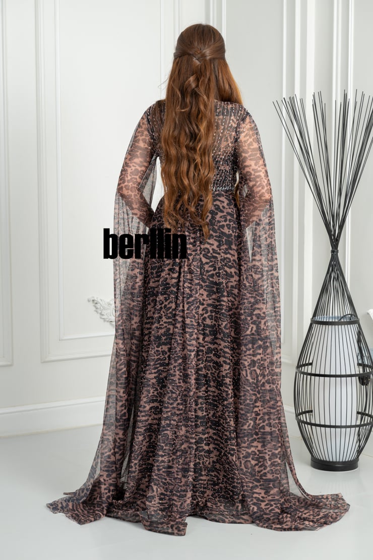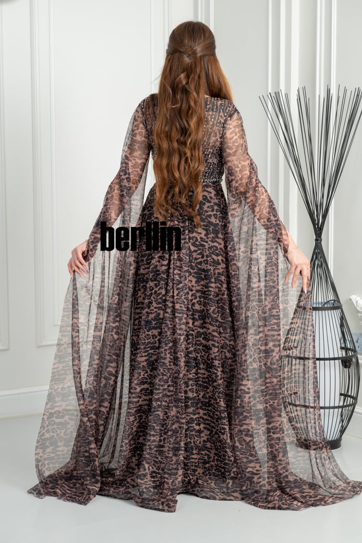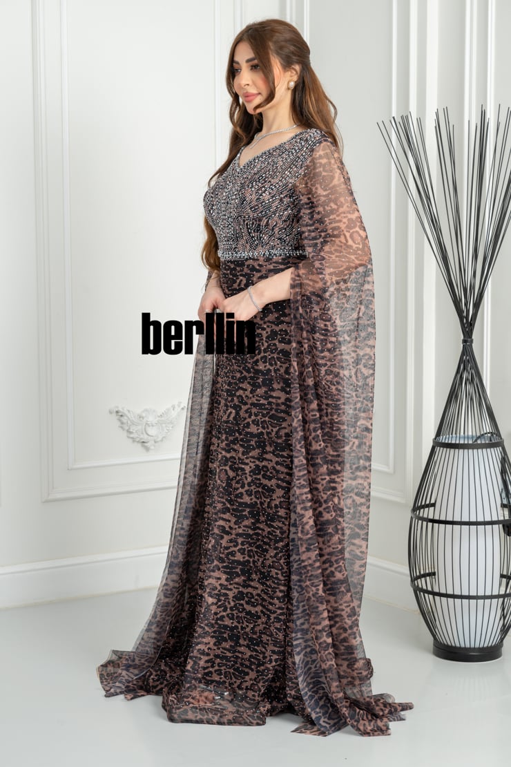 صُمّم الفستان من قماش تول فاخر بنقشة فهد أنيقة تتداخل فيها تدرجات البني والأسود بأسلوب فني متناغم يمنح التصميم عمقاً بصرياً وحركة ديناميكية أنيقة. التطريز الدقيق بالخيوط اللامعة يضيف لمسة من البريق الراقي دون أن يطغى على فخامة النقشة.