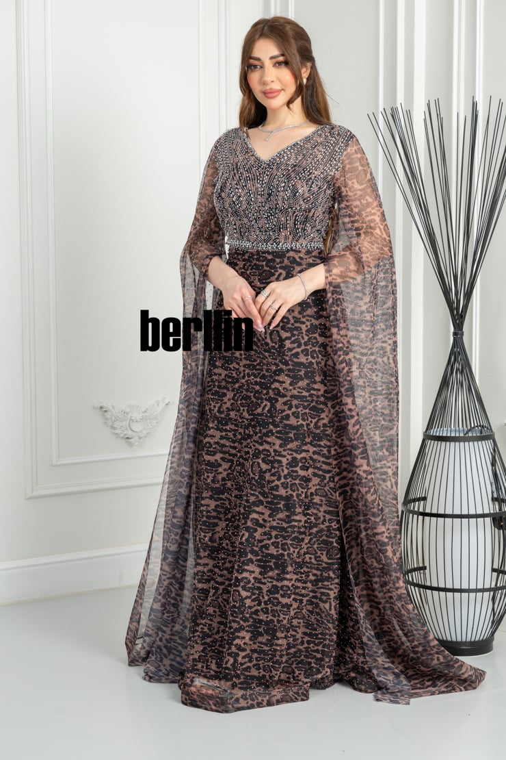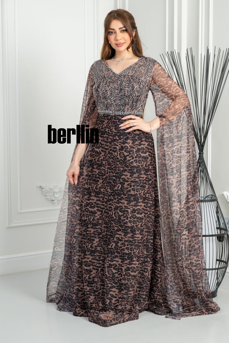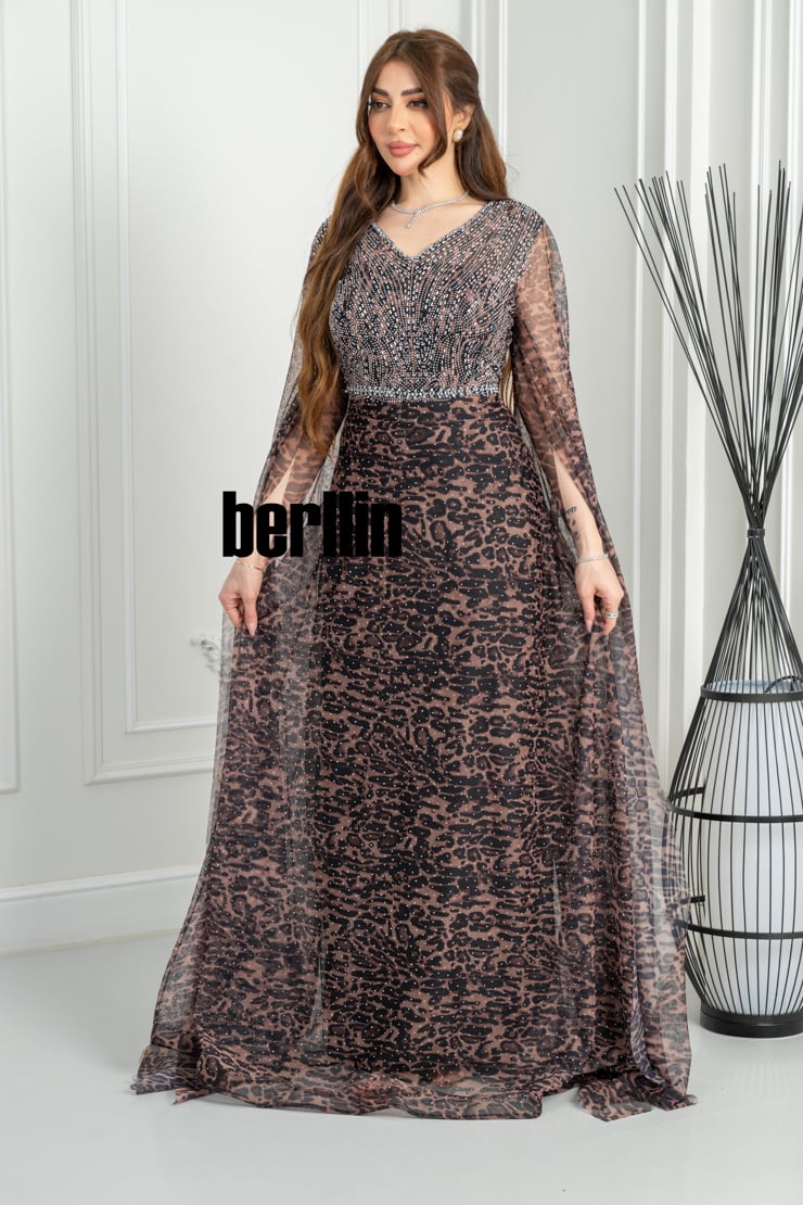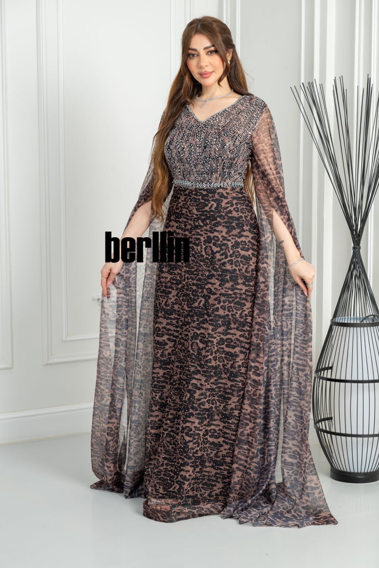 صُمّم الفستان من قماش تول فاخر بنقشة فهد أنيقة تتداخل فيها تدرجات البني والأسود بأسلوب فني متناغم يمنح التصميم عمقاً بصرياً وحركة ديناميكية أنيقة. التطريز الدقيق بالخيوط اللامعة يضيف لمسة من البريق الراقي دون أن يطغى على فخامة النقشة.