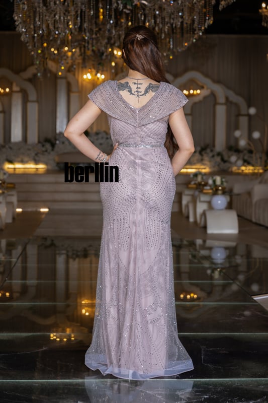 القماش تول ليلكي شفاف مطرّز يدويًّا بخيوط معدنية وأحجار كريستال دقيقة مرصوفة بأنماط هندسية ونقاط متدرّجة تُشبه قطرات مطر متلألئة. حزام رفيع مغطّى بالستراس يطوّق الخصر ليبرز انسيابية القوام ويقسم التصميم بلمسة لامعة.