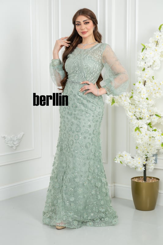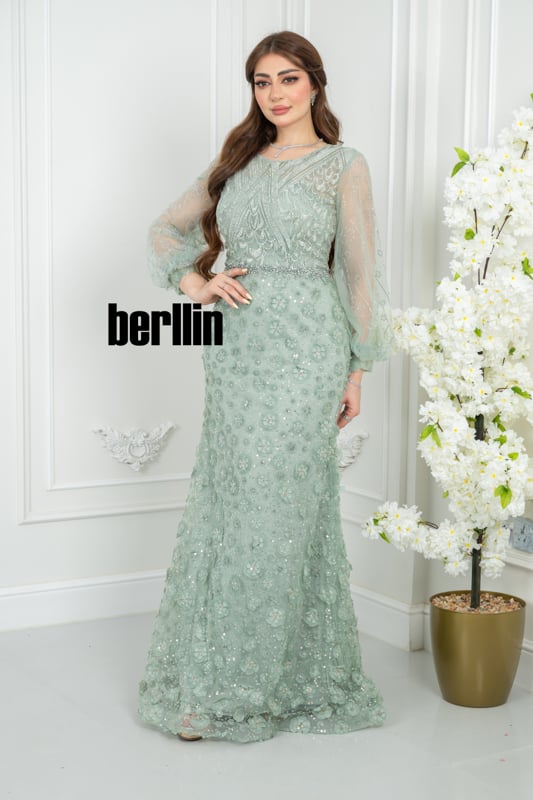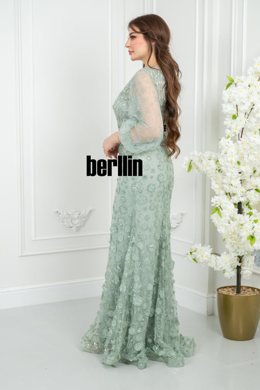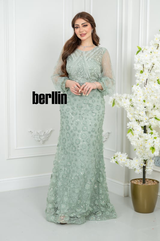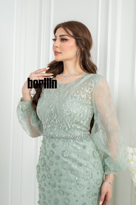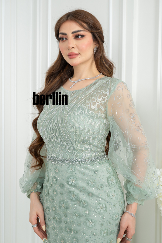 كأنّ سحابة نعناعٍ رقيقة تنسدل عليك؛ تتلألأ أزهارها الكريستالية بكل ومضة ضوء، بينما ترفرف أكمام التول المنفوخة كأجنحة ربيع، لتترك حولك هالةً من النسمات الزمردية الفاتنة.