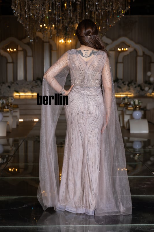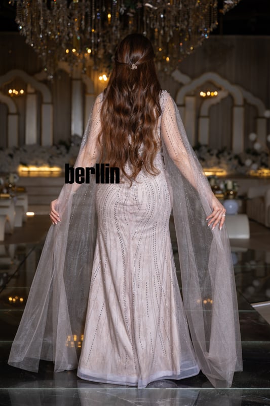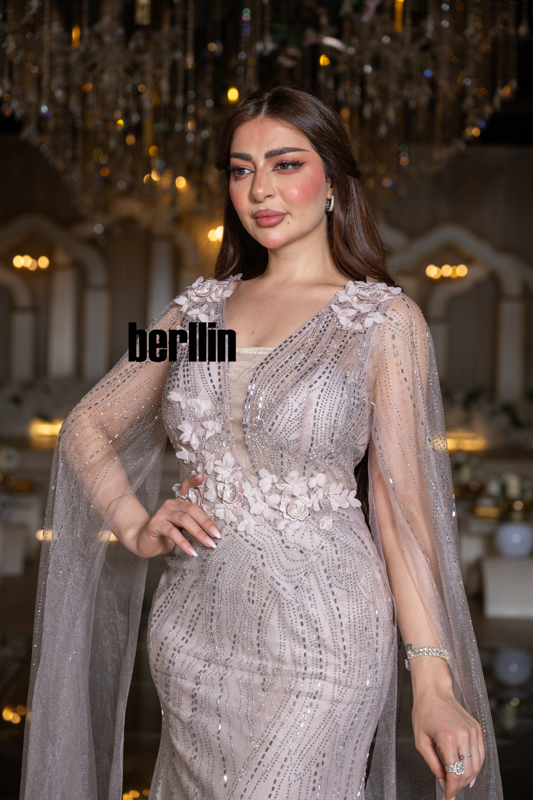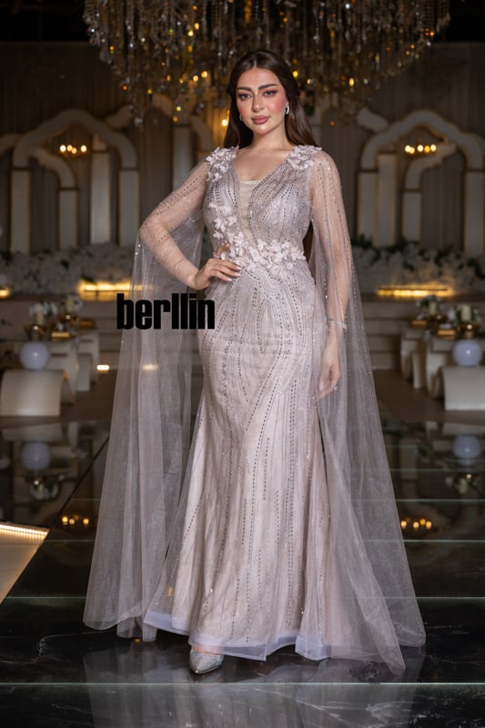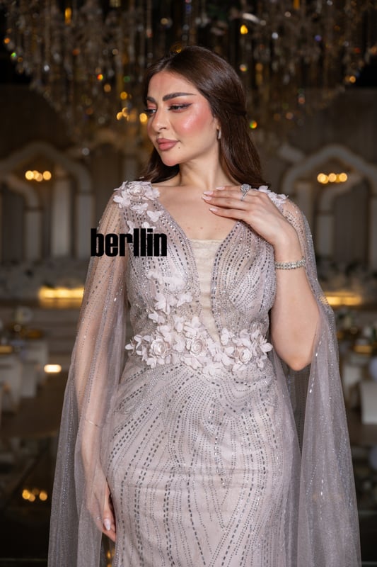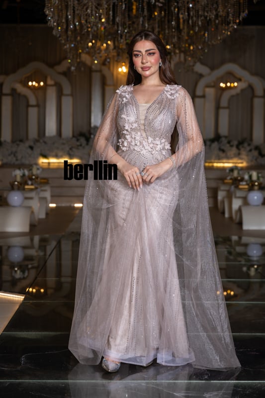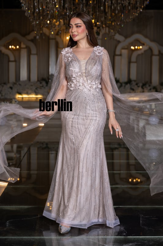 ارتدي “زهرة القمر” ودعيه يهمس بنعومة نور الفجر؛ زهور ثلاثيّة الأبعاد تتفتح حول خصرك كأنها حديقة صغيرة تتنفّس ضوءًا، وخيوط فضيّة ترسم على الفستان مسارات نجومٍ هاربة. يرفرف الكاب حول ذراعيك كضبابٍ ورديّ يُضيء خطواتك، فتغدو إطلالتك قصيدة عشقٍ تخلّدها سهرة لا تنسى.