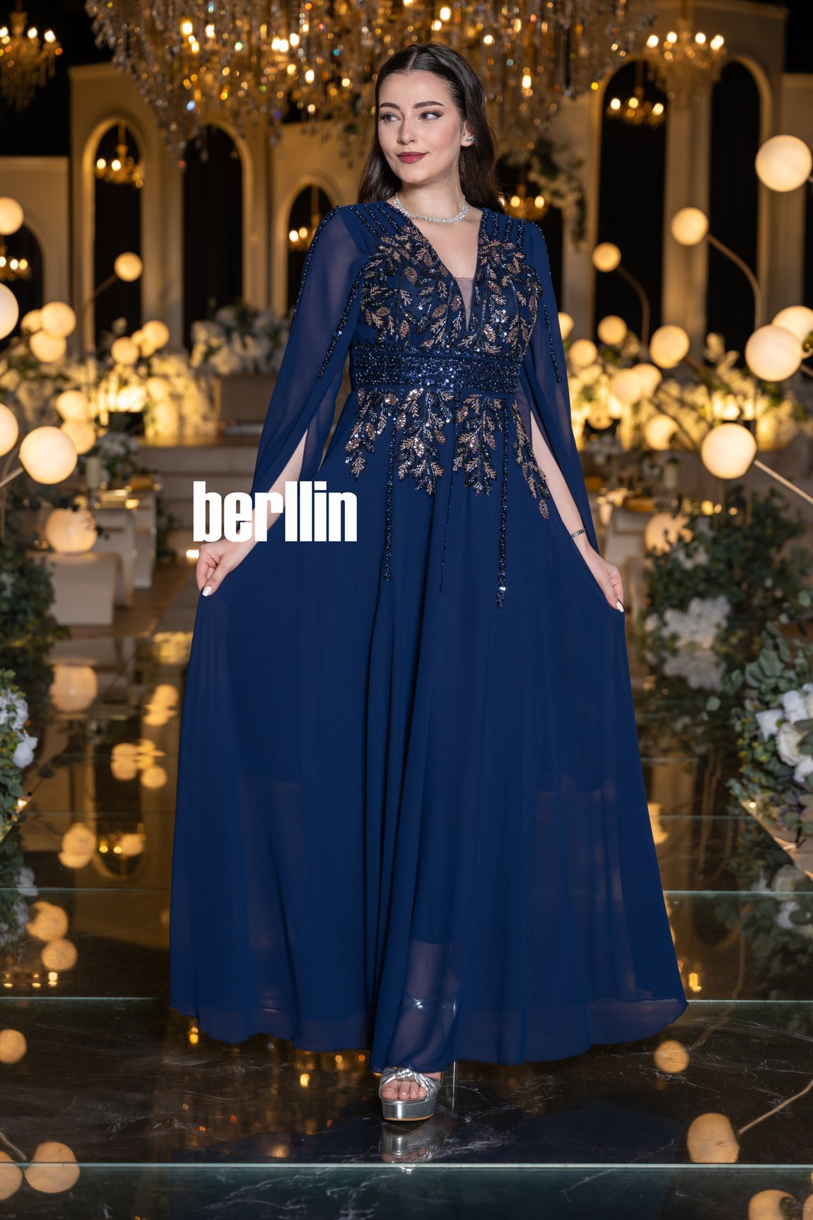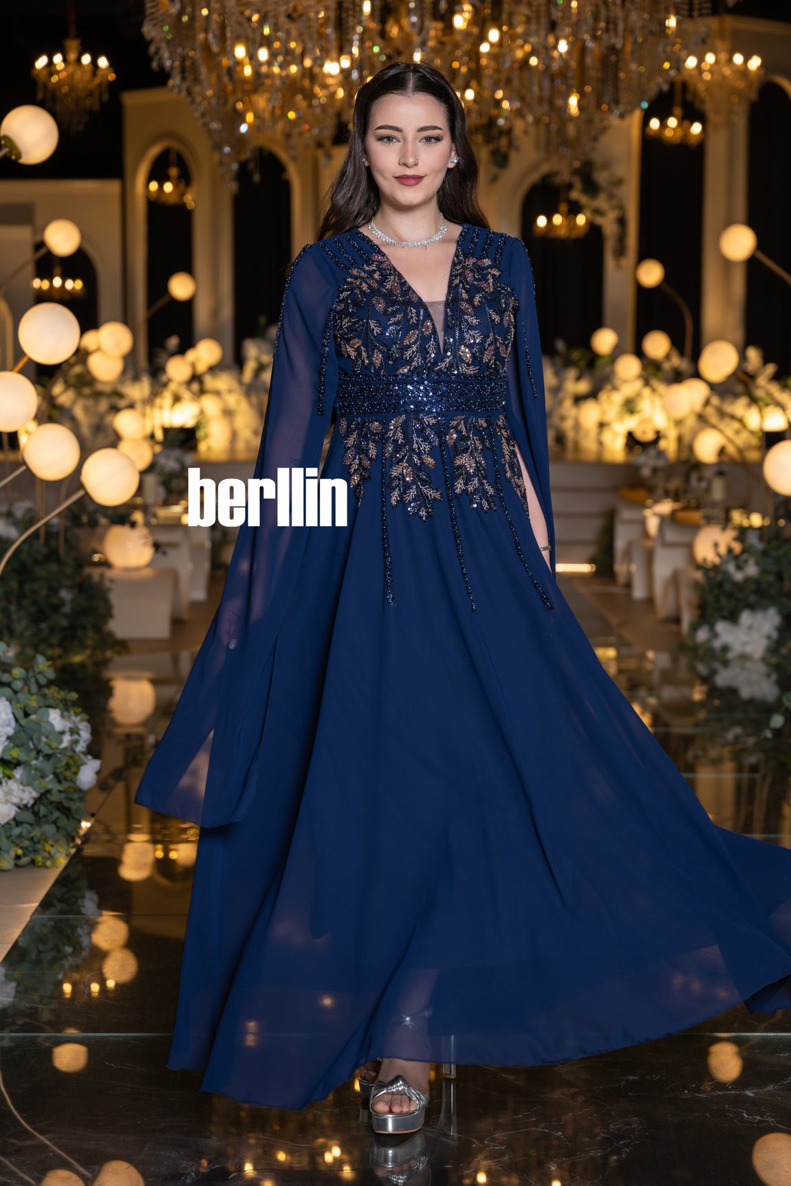 الأكمام مصممة بأسلوب واسع على شكل كاب انسيابي من قماش لامع خفيف ينسدل برقة على الذراعين ليمنح لمسة درامية وساحرة. أما التنورة، فهي مصنوعة من قماش براق بخياطة انسيابية واسعة، تضيف حركة أنيقة وانسيابية مثالية في المناسبات الفاخرة.