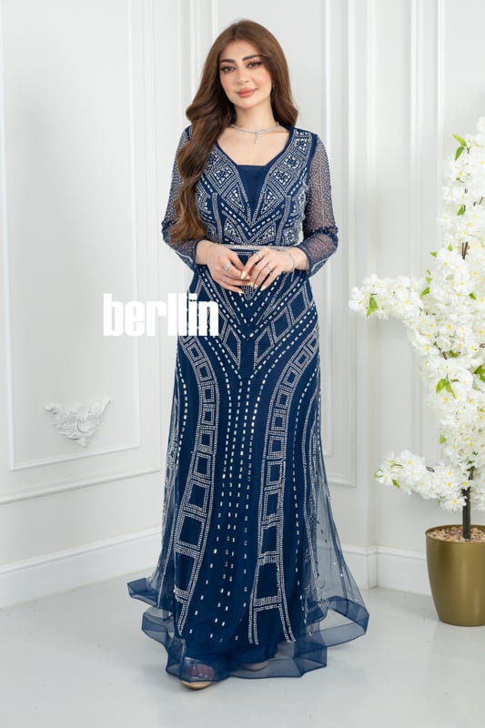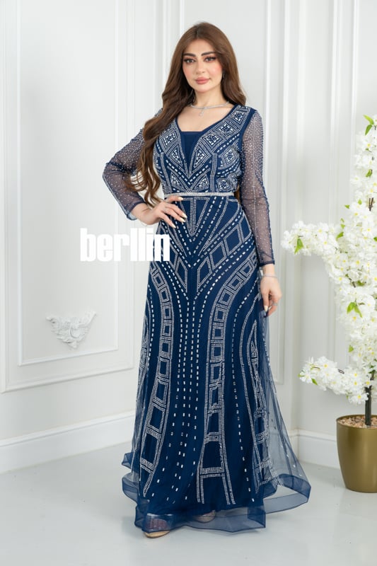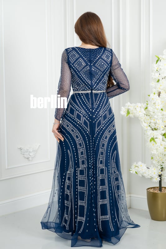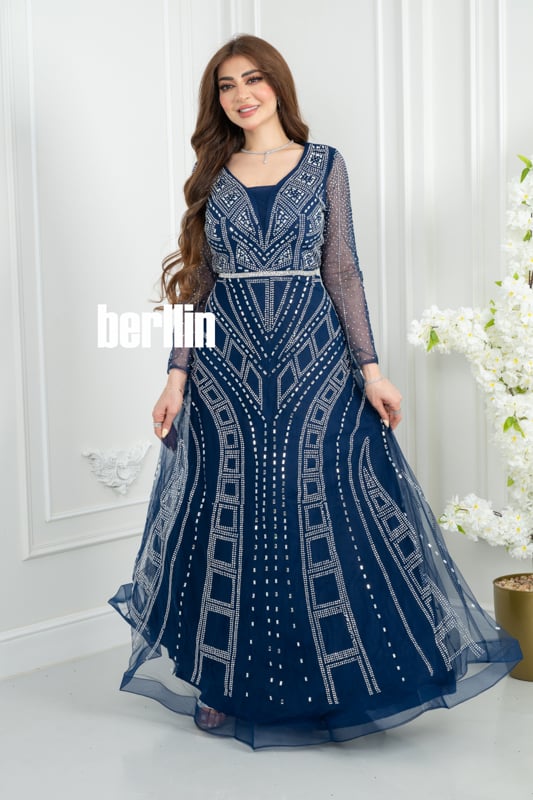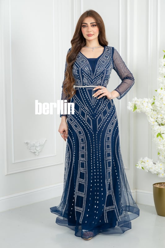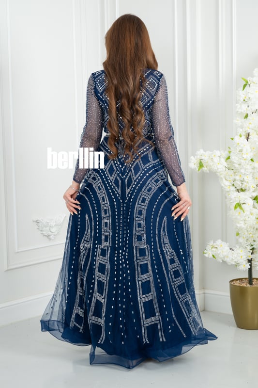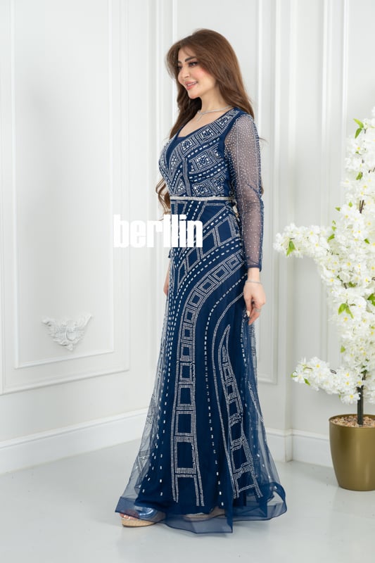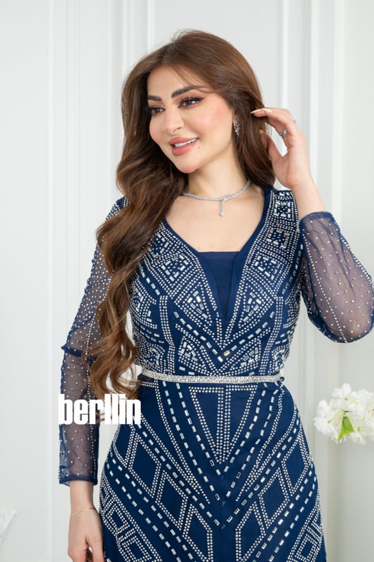 فستان سهره كحلي مطرز بنمط هندسي وأكمام شفافة