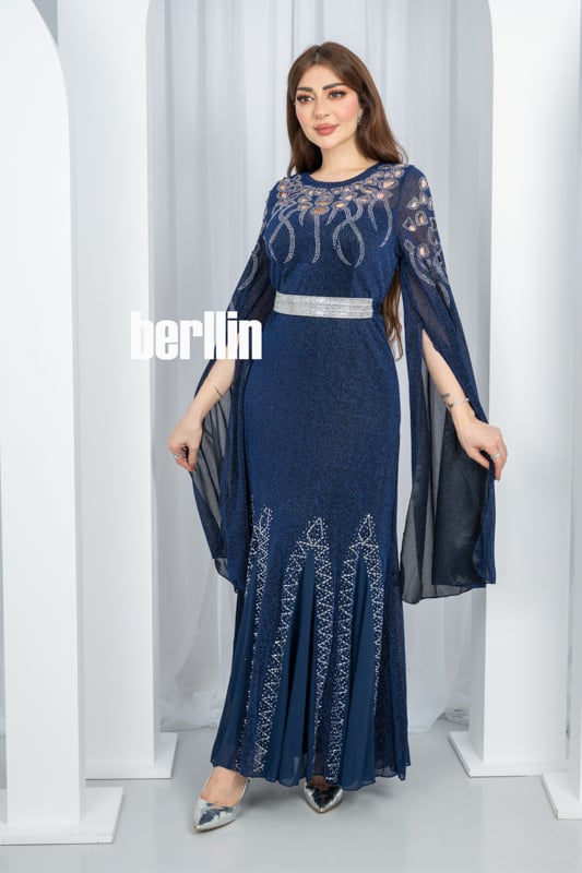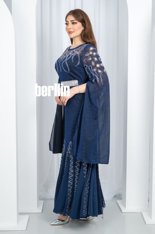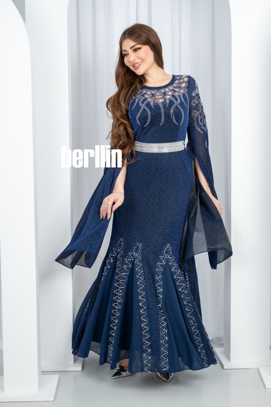 يتلألأ هذا الفستان الكحلي كسماء ليلية مرصعة بالنجوم تنبض بخيوط فضية حول خصرك وتمتد في أجنحة شيفون تحلّق مع كل خطوة لتتركي خلفك أثرًا من السحر اللامع.