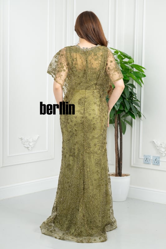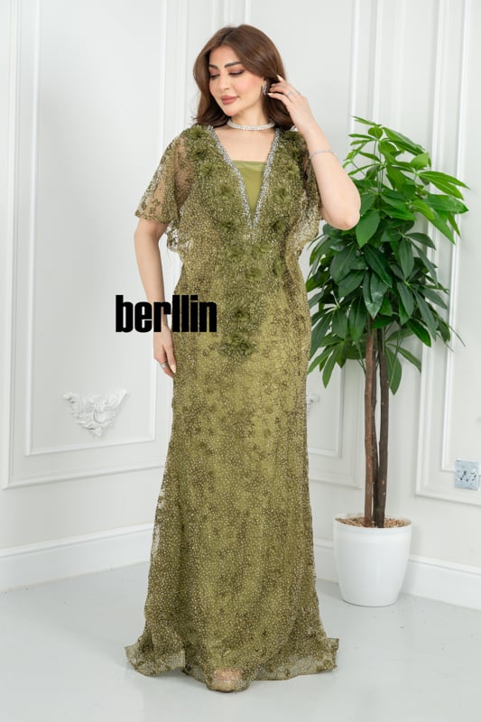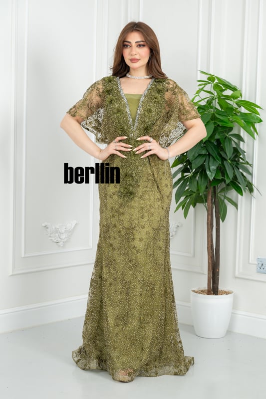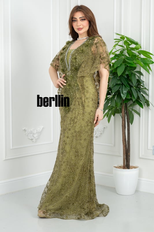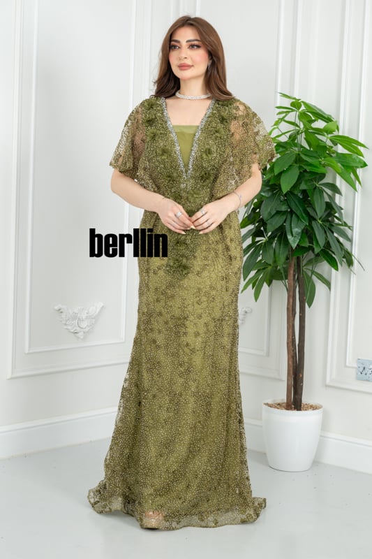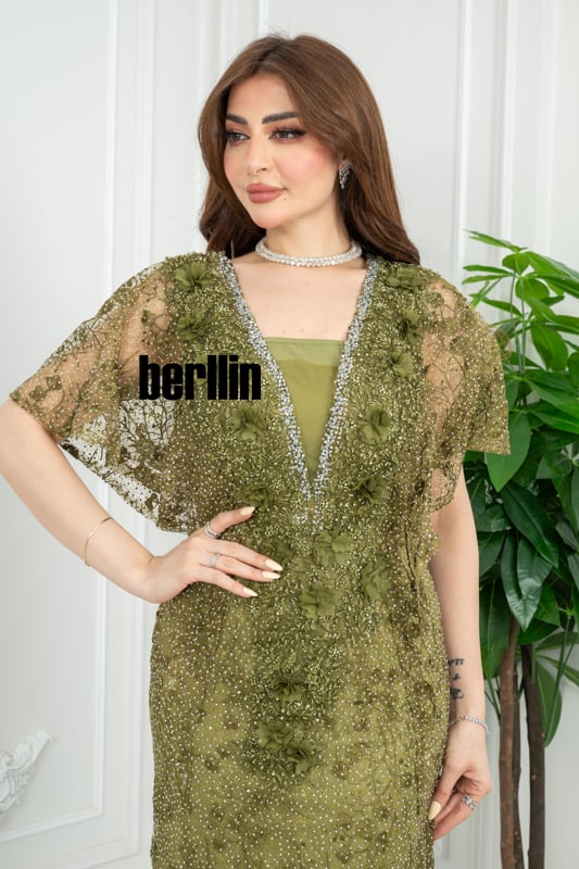 يلتفّ هذا الفستان الزيتوني حولك كضوءٍ خافت بين أشجار الغار؛ تتلألأ خرزاته كنقاط ندى، فيما يرفرف كاب الدانتيل على كتفيك كنسمة غابة صيفيّة، ليُخلِّف خلفك أثرًا من الهدوء الملكي والبريق المترف.