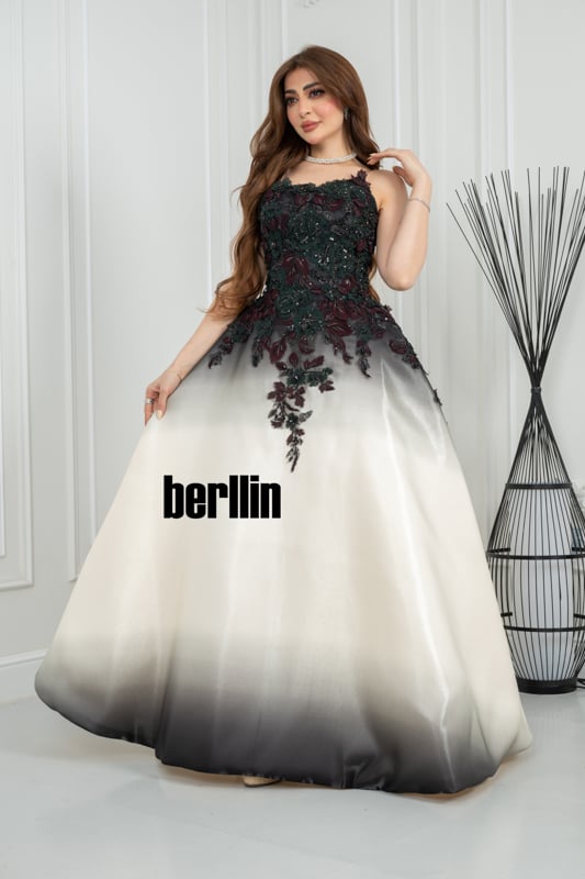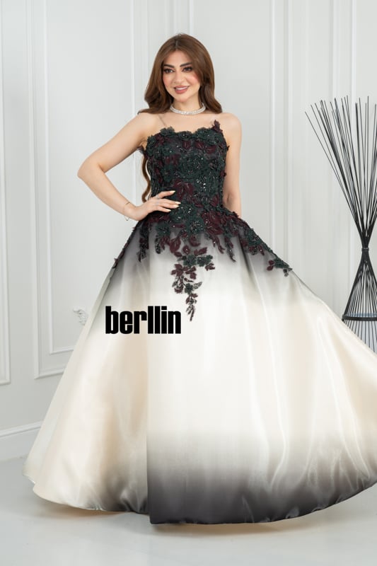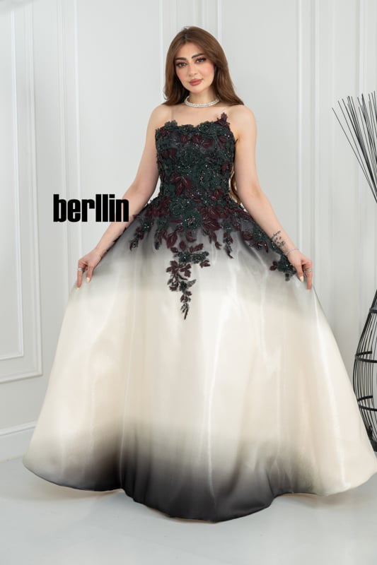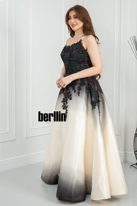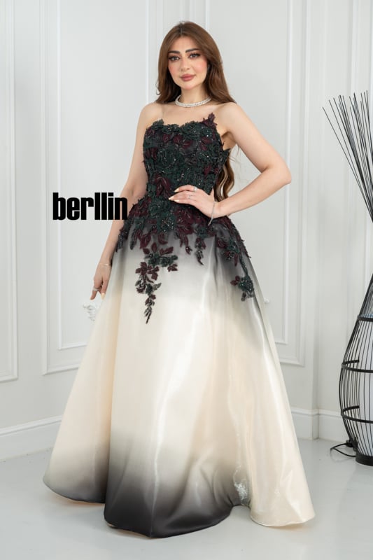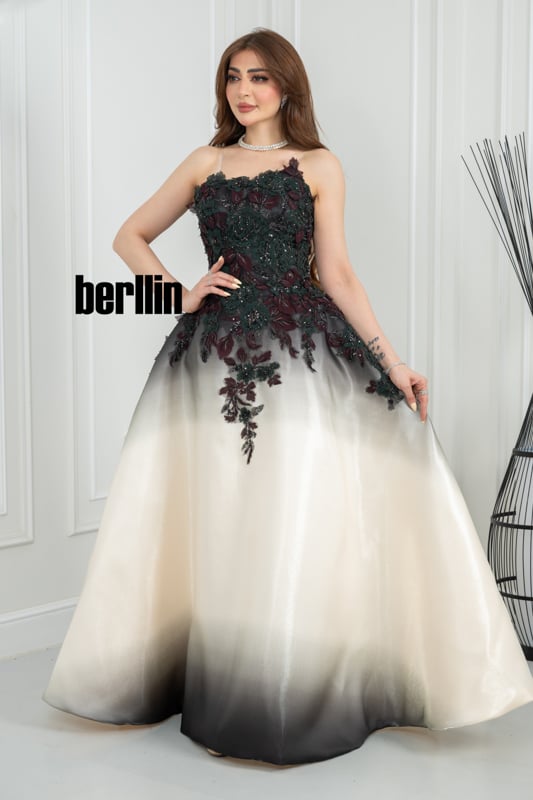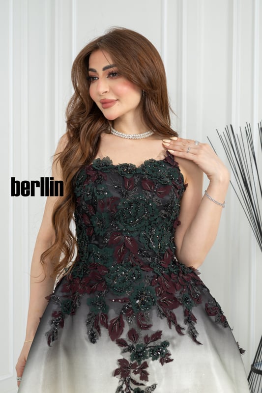 كأنكِ وردةٌ فجرية تتفتح عند الطرف بين ضوء العاجي وظلال الرمادي، يزدان جذعك بتطريزٍ من غابات زمردية ونسمات عنابية، فتتراقص طبقات الساتان حولك كضبابٍ حريريٍّ يحرس أميرة الليل. مع كل خطوة، ينحني الضوء لينسج حكاية فخامةٍ خالدة في عيون الحضور.