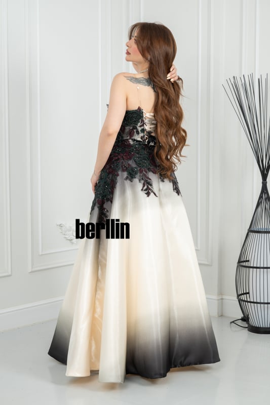فستان سهرة ball gown يبدأ بلون عاجي حريري ويتحوّل تدريجيًا إلى رمادي داكن عند الحاشية بتقنية أومبري ساحرة. مصنوع من ساتان ميكادو لامع يمنح ثباتًا وأناقة ملكية، مع بطانة ناعمة لراحة مثالية.