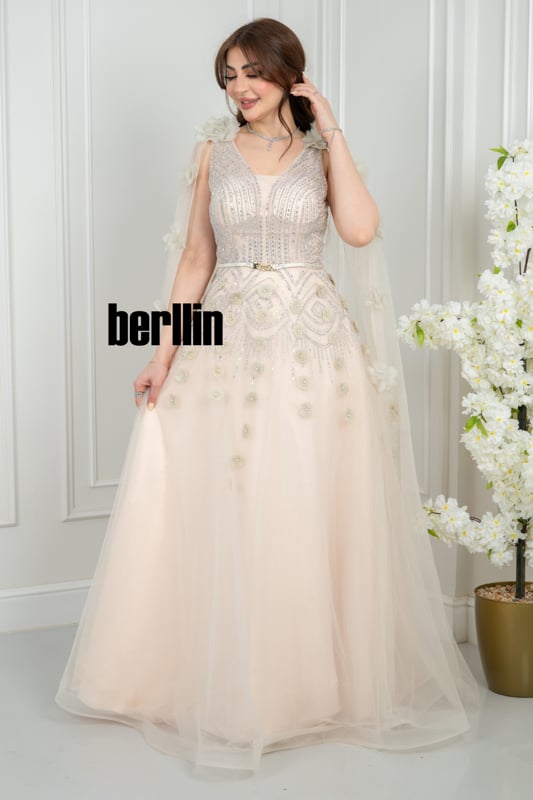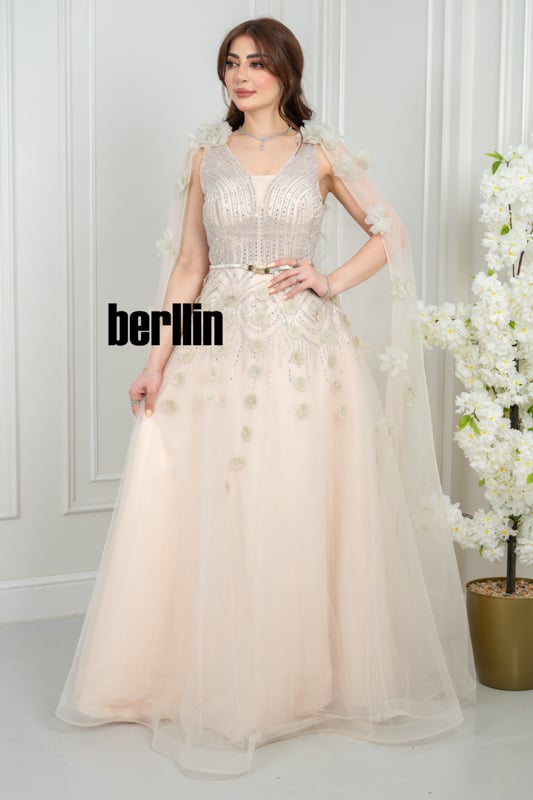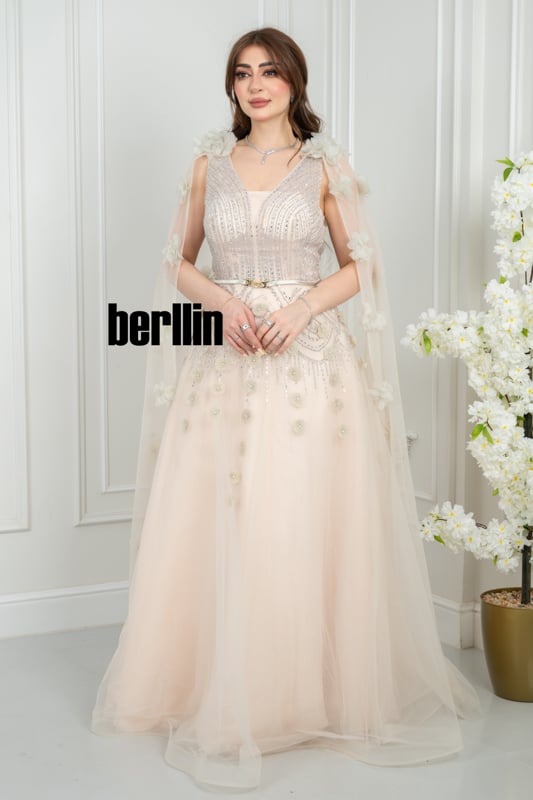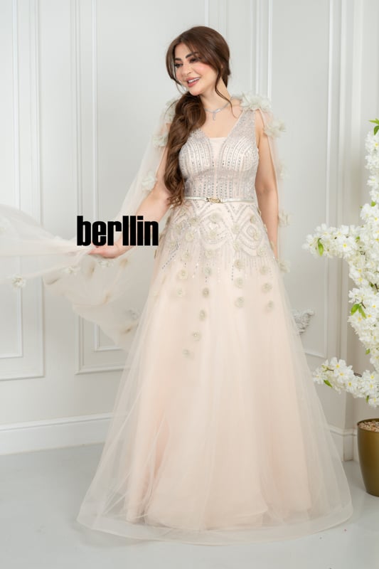 يخطف هذا الفستان الخوخي الأنفاس كحديقة ربيعية تتلألأ تحت ضوء القمر؛ تتراقص أزهاره الثلاثية حول كتفيك، بينما تنساب تنورته التول كغلالة ضباب معطرة بعبير الأنوثة.