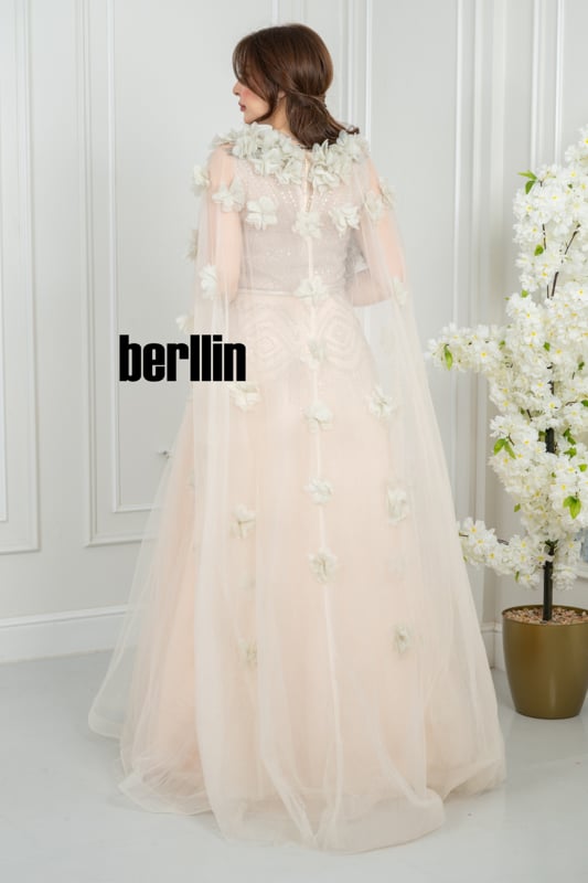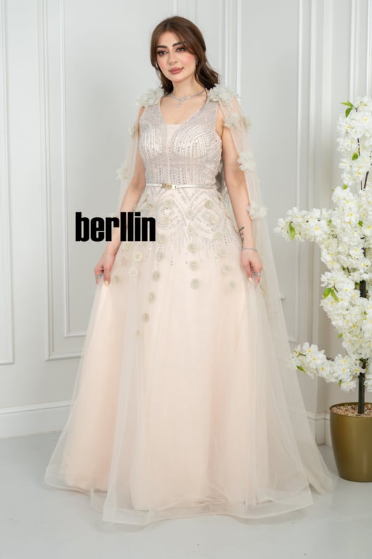 يعتمد الفستان قصّة A-Line أنثوية تتّسع بانسياب من الخصر حتى الأرض. الصدر بياقة V ناعمة ومُطرّز بخطوط خرزية عمودية تشدّ العين إلى الأعلى، يلتف حوله كاب تول شفاف ينسدل من الأكتاف بطول الأرض وتتخلّله ورود ثلاثية الأبعاد بلون شامبانيا تضفي تأثير «عقد زهور» متحرك. يحدّد الخصر حزام معدني رفيع مطلي بالذهب الوردي، فيما تُرصِّع منطقة الحوض زخارف خرزية هلالية تتناثر تحتها أزهار صغيرة متناثرة قبل أن تختفي داخل تنورة التول المتعددة الطبقات.