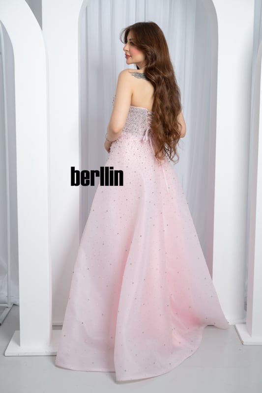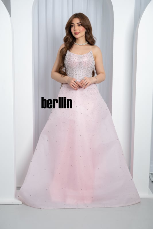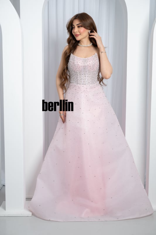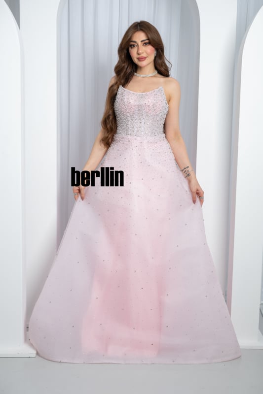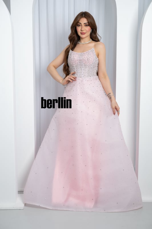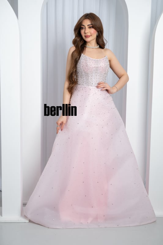 يُشعرك هذا الفستان الوردي وكأنكِ تمشين وسط غيمة من ضوء اللآلئ؛ يتلألأ صدره كسماء مرصّعة بالنجوم، فيما تُرفرف تنورته الواسعة كنسمة ربيع تحمل سحر الأميرات.