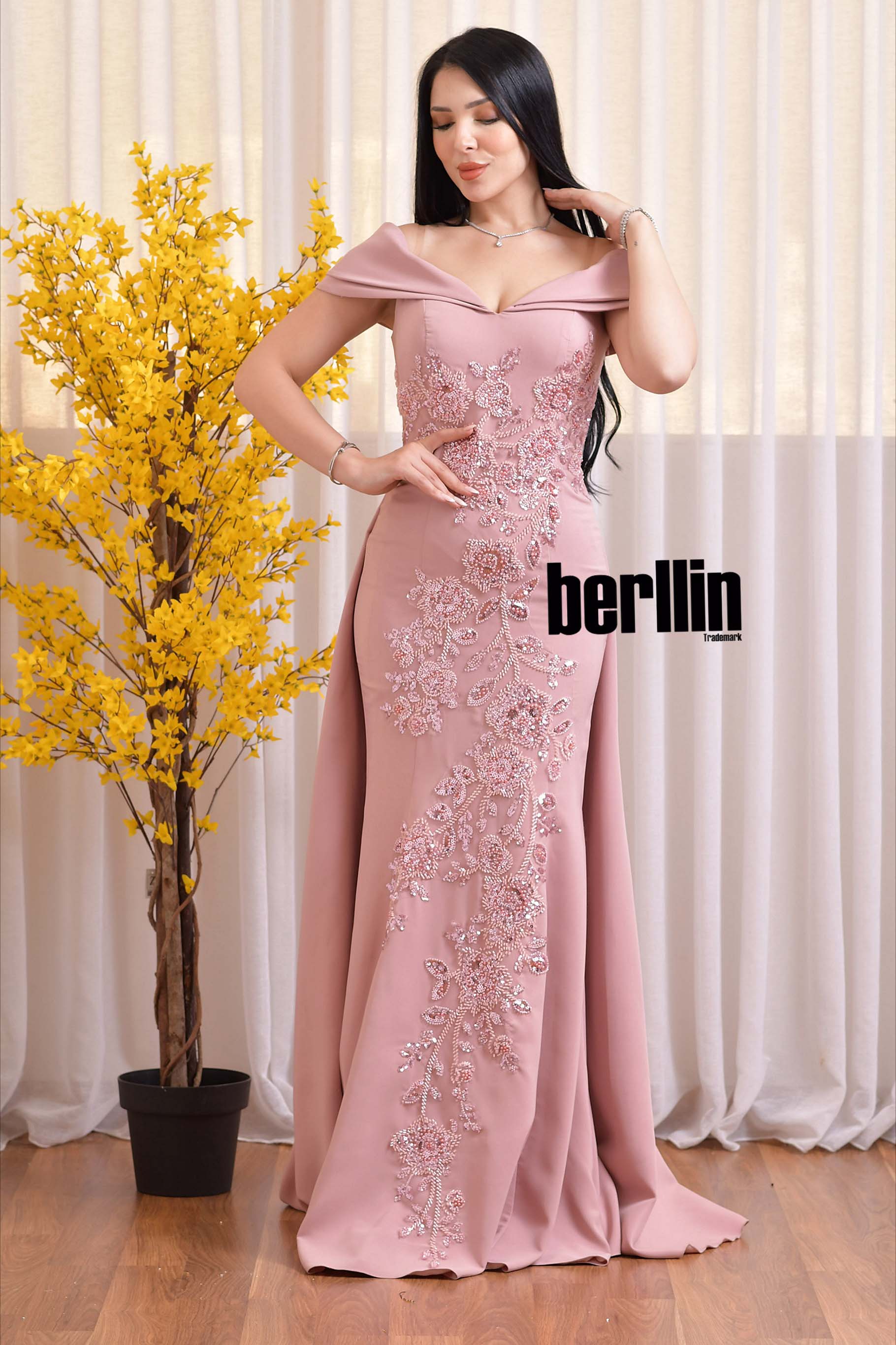 تخيّلي هالة السحر حين تتلألأ خيوط التطريز السوداء تحت الأضواء، لتُعيد رسم قوامك برشاقة منحوتة وتمنحك مظهراً أشبه بسمفونية ليلية آسرة. يعانق خط الأكتاف المكشوفة بشرتك كالحرير، فيبرز تمازج الأنوثة والقوة بلمسة رومانسية تأسر الأنظار. أما القصة المُحكمة فتنحت خصرك بانسيابية ثم تنساب بذيلٍ فاخر يترك خلفك أثر فخامة مبهرة، لتعيشي لحظة تُحفر في الذاكرة كعنوان للجاذبية المطلقة.