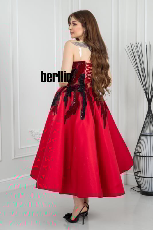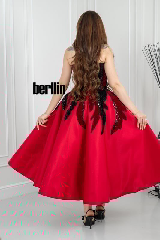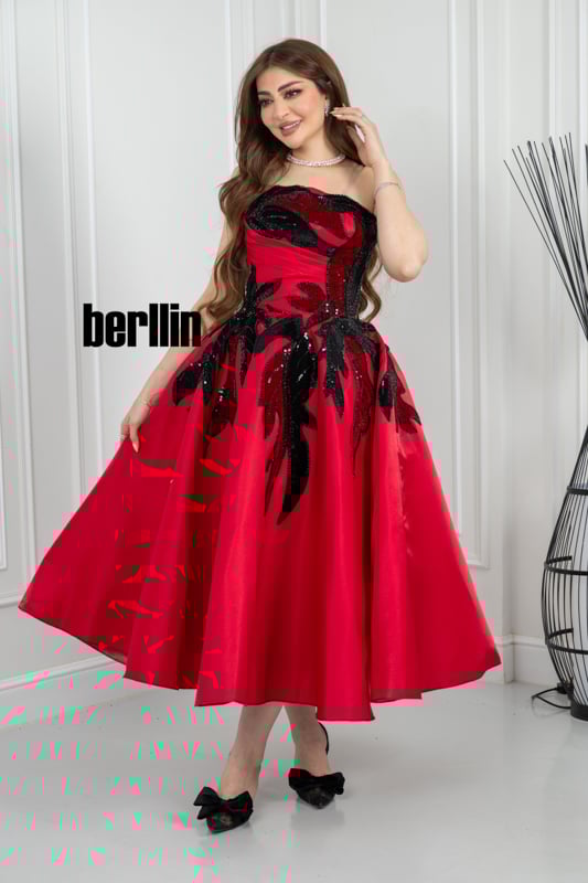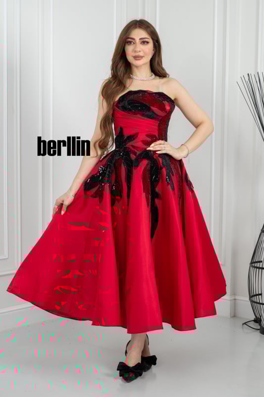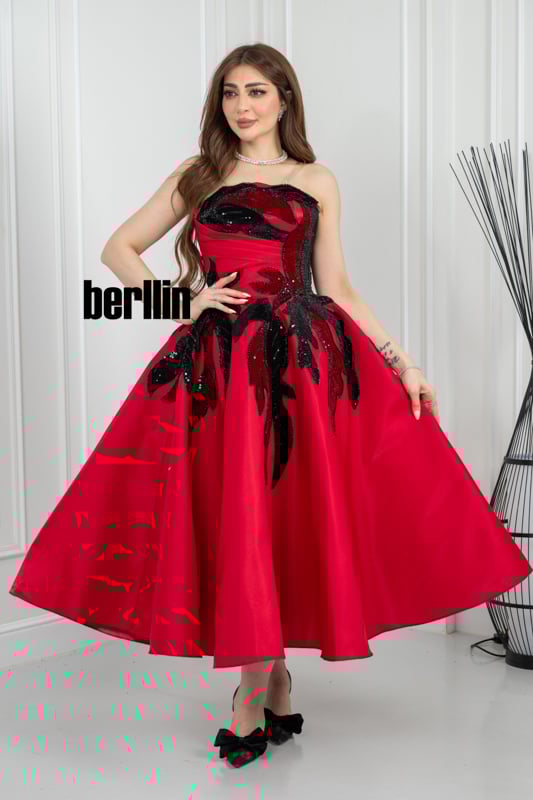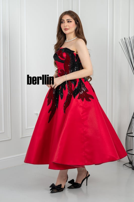 فستان سهرة ميدي بلون أحمر حيوي مصنوع من تاڤتا حريريّة متينة تمنح ثباتًا وانسيابية لامعة، مع تطريز أوراق سوداء من ترتر لامع يضفي عمقًا وبريقًا فاخرًا.