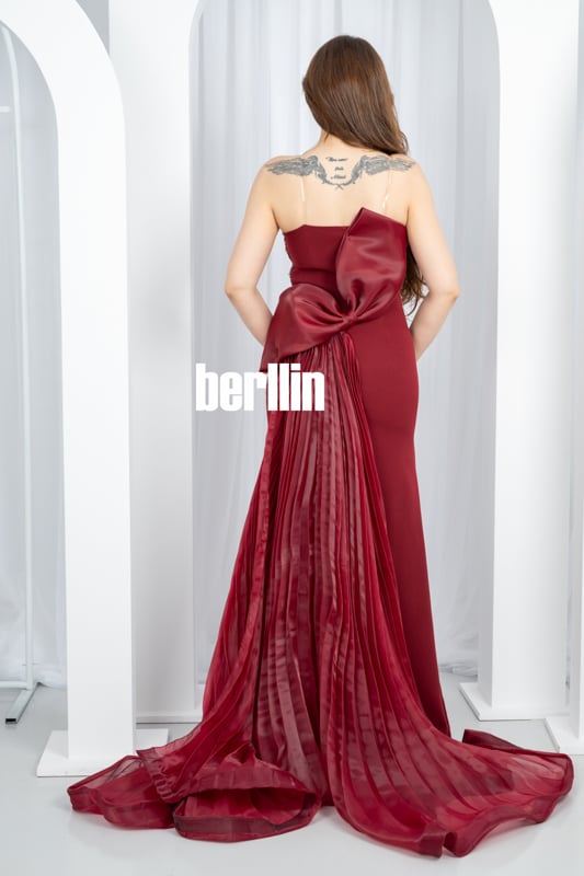 فستان بقصّة حورية البحر (Mermaid Fit & Flare)، يلتصق بالجسم من الصدر إلى ما تحت الركبة ثم يتسع تدريجيًّا إلى ذيل جانبي درامي مزوّد بشيفون يدوي الطيّ (Hand-Pleated) يمنح حركة انسيابية مع كل خطوة.
