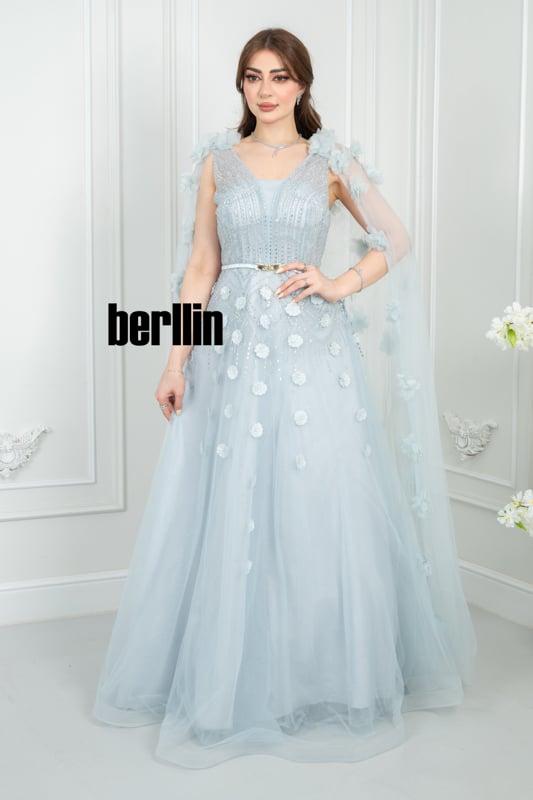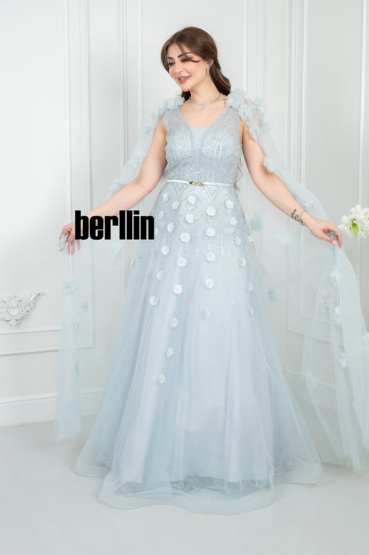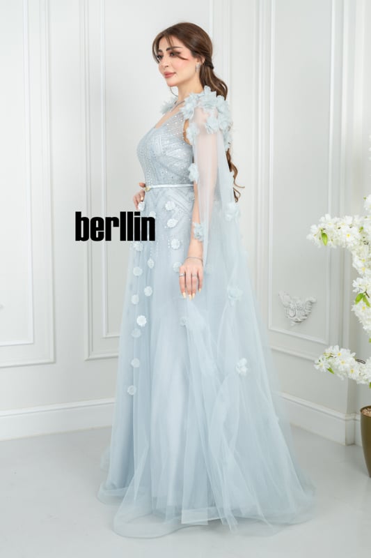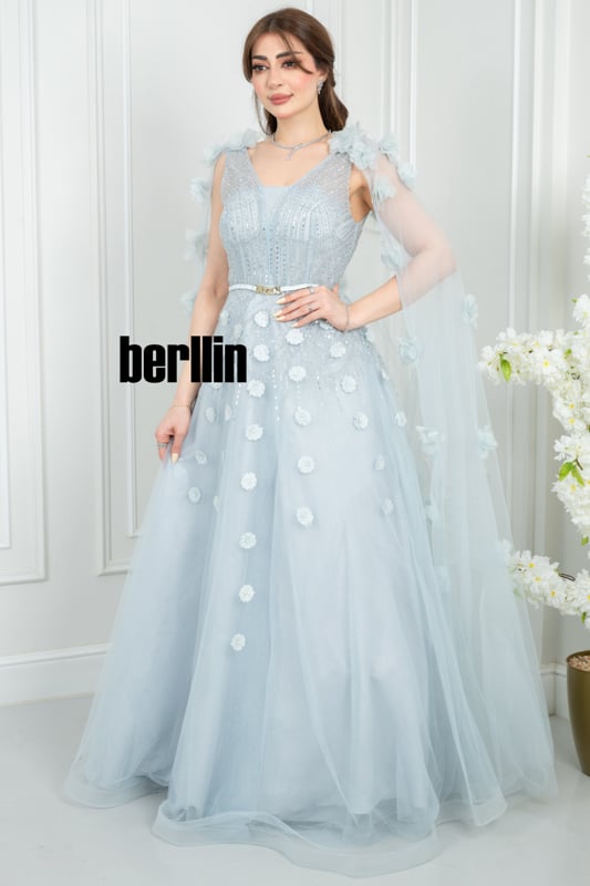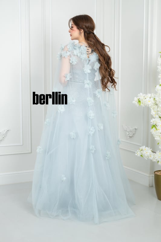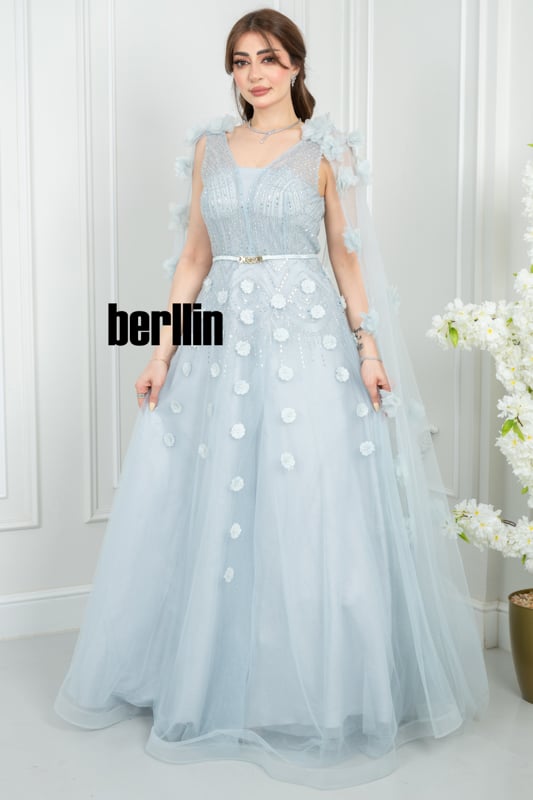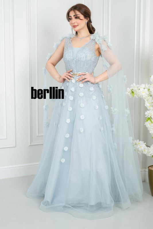 قصّة A-Line تبدأ بصدرٍ بحمّالات رفيعة مُرصّع بخطوط خرزية فضيّة تتلألأ تحت الضوء، ينسدل من الأكتاف كاب تول شفاف بطول الأرض تتناثر عليه أزهار أورغنزا ثلاثية الأبعاد بأطياف سماوية. حزام معدني رفيع مطلي بالذهب الأبيض يحدّد الخصر، بينما تتدرّج زخارف خرزية وأزهار صغيرة نزولًا على بداية التنورة قبل أن تختفي داخل طبقات التول المتعددة فتمنح حركة حالمة وانسيابًا ملكيًا.