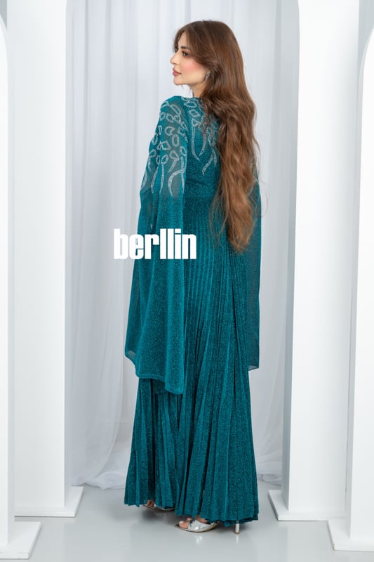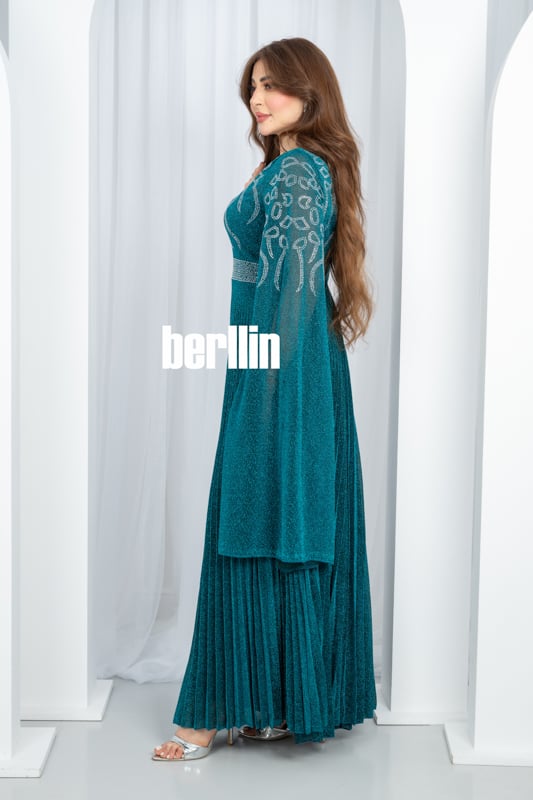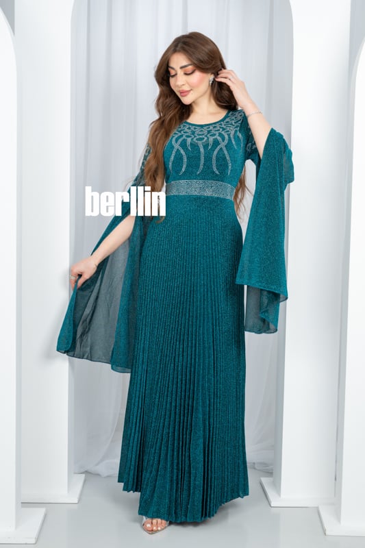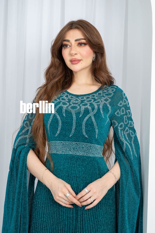 يُشبه هذا الفستان فيروزيَّة موجة بحرٍ تتلألأ عند الغروب؛ تتراقص طياته كتموّجات الماء، وتُشرق أكمامه كأجنحة ضوء شفافة، ليترك حولك هالةً من الانتعاش المتلألئ.