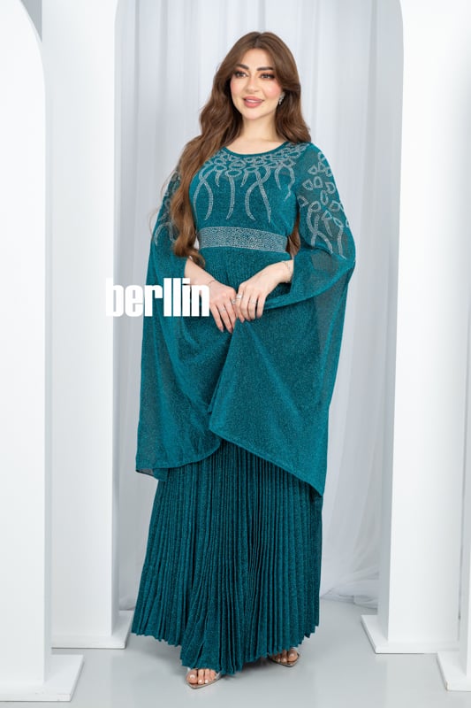 الجسم الرئيسي من جيرسي فيروزي مُمَوْج بخيوط لوريكس عاكسة للضوء تمنح مرونة مريحة ولمعانًا مائيًّا هادئًا. التنورة مطوية بالكامل بتقنية حرارية تحفظ الشكل من دون فقدان الانسيابية. الأكمام من شيفون خفيف الوزن يسمح بتهوية لطيفة وحركة رشيقة. البطانة الداخلية من ساتان حريري صناعي بملمس بارد لضمان راحة طوال الأمسية.