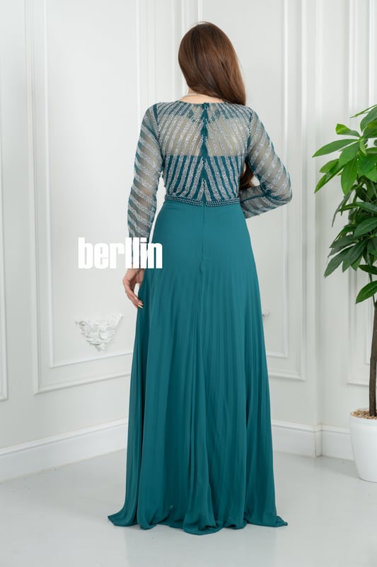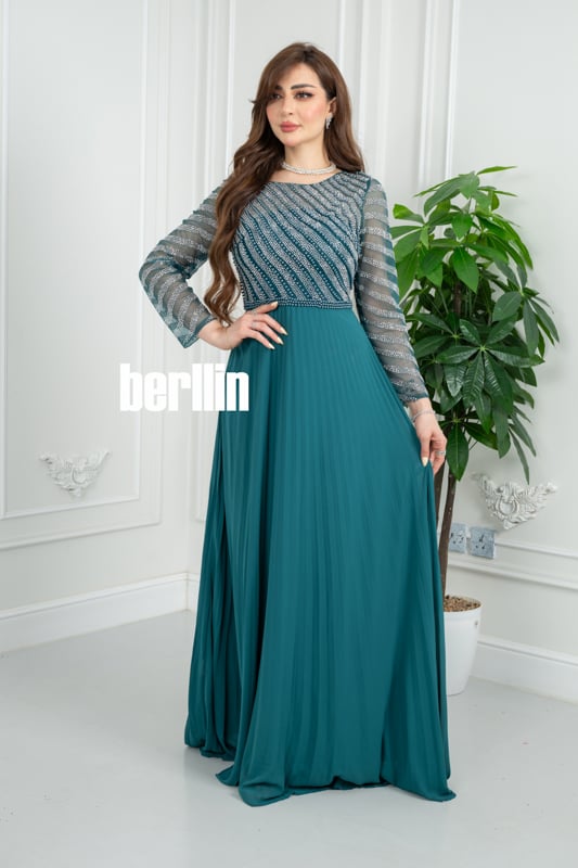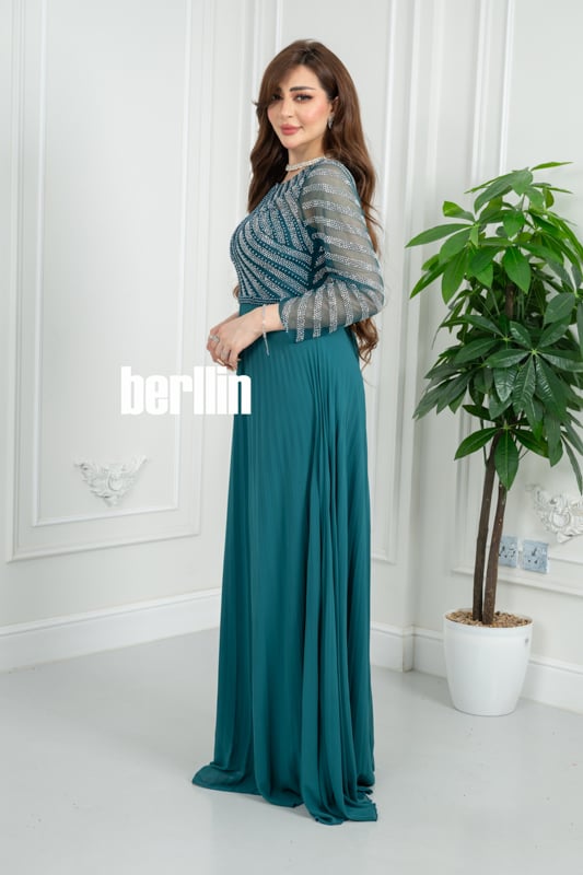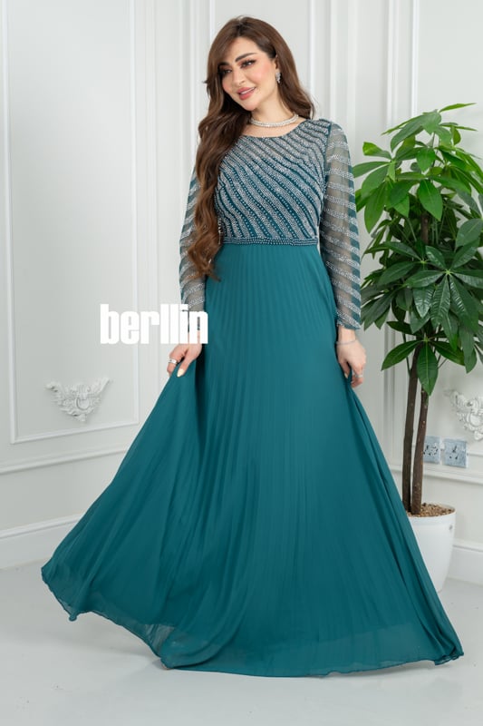 ينساب هذا الفستان التركوازي كجدولٍ من الضوء؛ تتلألأ خطوط الترتر على صدرك كأمواج فضيّة، فيما ترقص طيات التنورة البليسيه مع كل خطوة لتخلّف هالةً من الأناقة اللامعة.